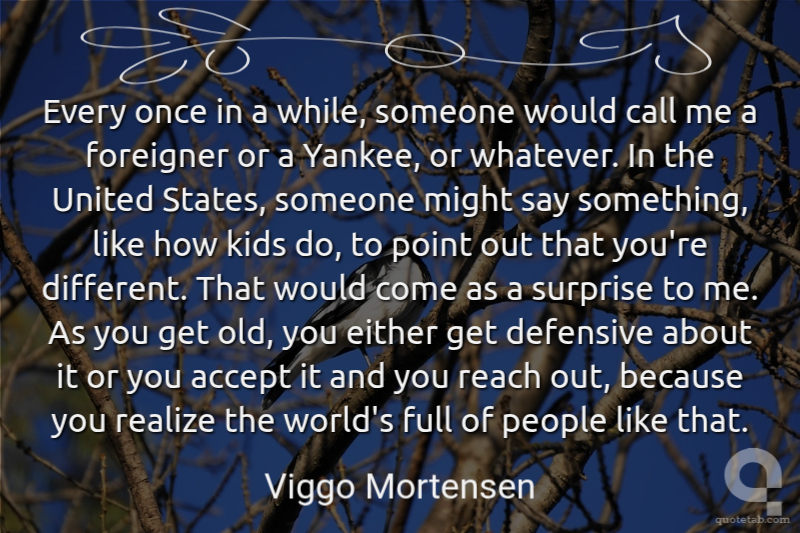 Every once in a while, someone would call me a foreigner or a Yankee, or whatever. In the United States, someone might say something, like how kids do, to point out that you're different. That would come as a surprise to me. As you get old, you either get defensive about it or you accept it and you reach out, because you realize the world's full of people like that.