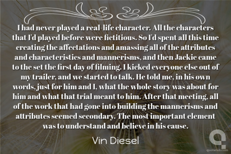 I had never played a real-life character. All the characters that I'd played before were fictitious. So I'd spent all this time creating the affectations and amassing all of the attributes and characteristics and mannerisms, and then Jackie came to the set the first day of filming. I kicked everyone else out of my trailer, and we started to talk. He told me, in his own words, just for him and I, what the whole story was about for him and what that trial meant to him. After that meeting, all of the work that had gone into building the mannerisms and attributes seemed secondary. The most important element was to understand and believe in his cause.