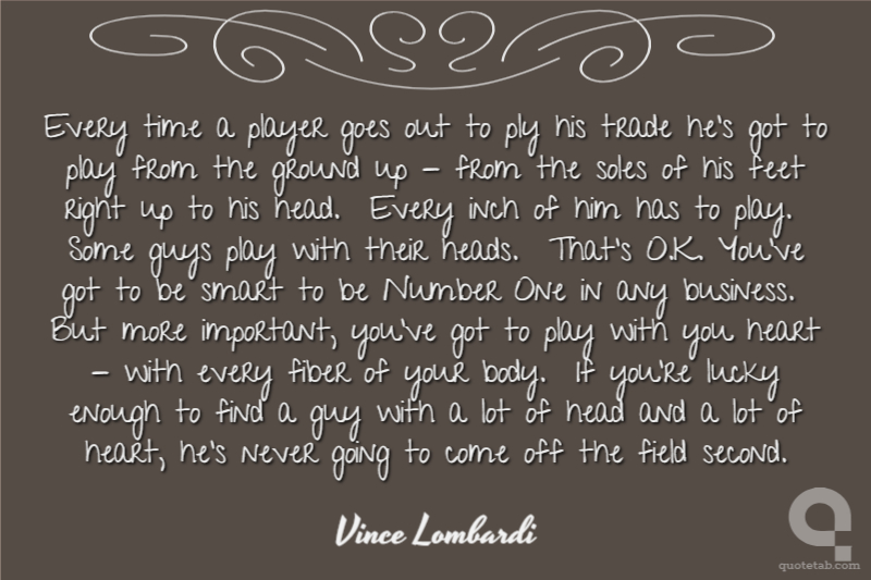 Every time a player goes out to ply his trade he's got to play from the ground up - from the soles of his feet right up to his head. Every inch of him has to play. Some guys play with their heads. That's O.K. You've got to be smart to be Number One in any business. But more important, you've got to play with you heart - with every fiber of your body. If you're lucky enough to find a guy with a lot of head and a lot of heart, he's never going to come off the field second.