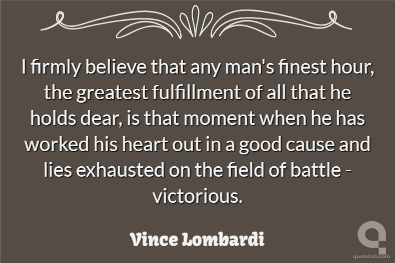 I firmly believe that any man's finest hour, the greatest fulfillment of all that he holds dear, is that moment when he has worked his heart out in a good cause and lies exhausted on the field of battle - victorious.