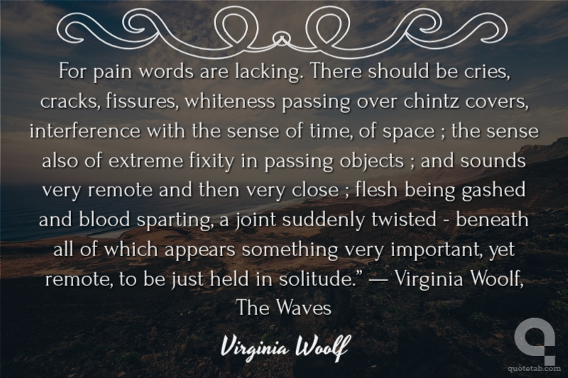 For pain words are lacking. There should be cries, cracks, fissures, whiteness passing over chintz covers, interference with the sense of time, of space ; the sense also of extreme fixity in passing objects ; and sounds very remote and then very close ; flesh being gashed and blood sparting, a joint suddenly twisted - beneath all of which appears something very important, yet remote, to be just held in solitude.” — Virginia Woolf, The Waves