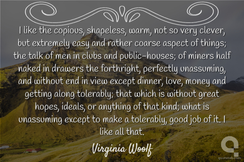 I like the copious, shapeless, warm, not so very clever, but extremely easy and rather coarse aspect of things; the talk of men in clubs and public-houses; of miners half naked in drawers the forthright, perfectly unassuming, and without end in view except dinner, love, money and getting along tolerably; that which is without great hopes, ideals, or anything of that kind; what is unassuming except to make a tolerably, good job of it. I like all that.