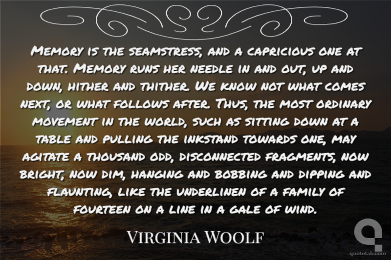 Memory is the seamstress, and a capricious one at that. Memory runs her needle in and out, up and down, hither and thither. We know not what comes next, or what follows after. Thus, the most ordinary movement in the world, such as sitting down at a table and pulling the inkstand towards one, may agitate a thousand odd, disconnected fragments, now bright, now dim, hanging and bobbing and dipping and flaunting, like the underlinen of a family of fourteen on a line in a gale of wind.