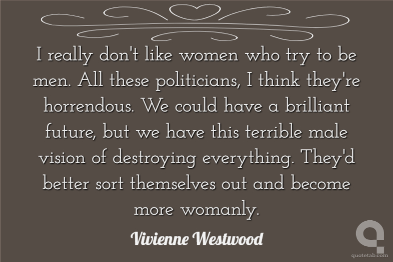 I really don't like women who try to be men. All these politicians, I think they're horrendous. We could have a brilliant future, but we have this terrible male vision of destroying everything. They'd better sort themselves out and become more womanly.