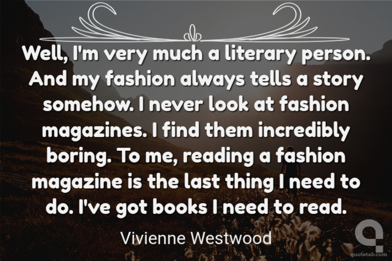 Well, I'm very much a literary person. And my fashion always tells a story somehow. I never look at fashion magazines. I find them incredibly boring. To me, reading a fashion magazine is the last thing I need to do. I've got books I need to read.