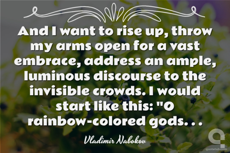 And I want to rise up, throw my arms open for a vast embrace, address an ample, luminous discourse to the invisible crowds. I would start like this: "O rainbow-colored gods. . .