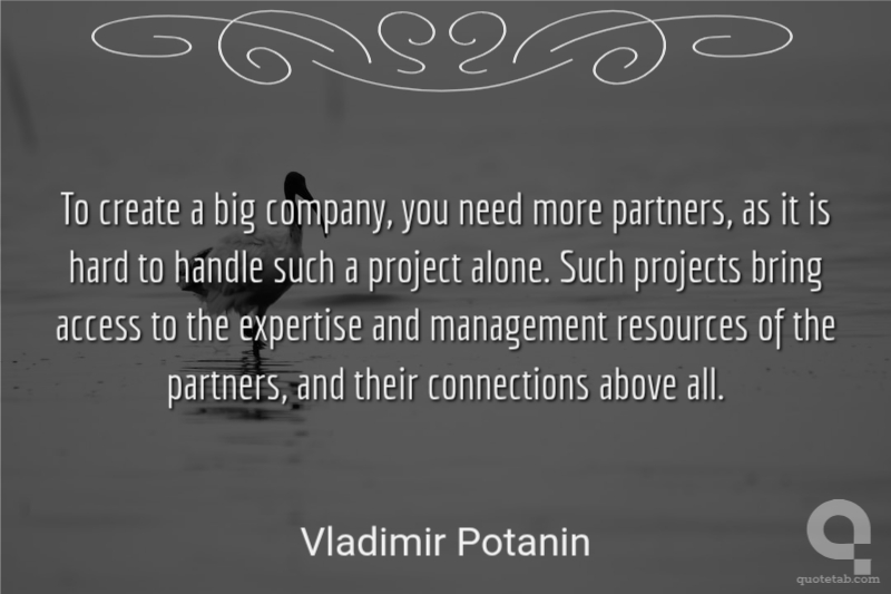 To create a big company, you need more partners, as it is hard to handle such a project alone. Such projects bring access to the expertise and management resources of the partners, and their connections above all.