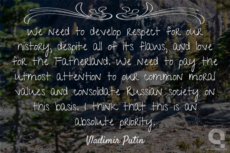 We need to develop respect for our history, despite all of its flaws, and love for the Fatherland. We need to pay the utmost attention to our common moral values and consolidate Russian society on this basis. I think that this is an absolute priority.