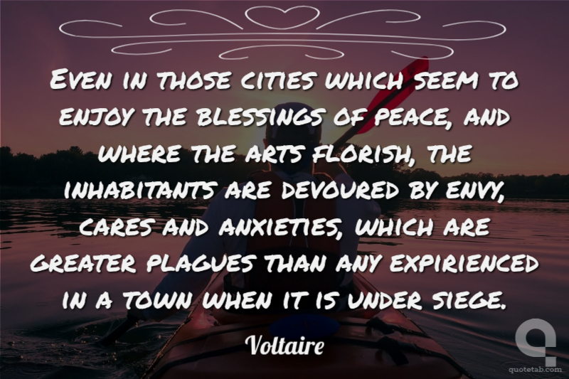 Even in those cities which seem to enjoy the blessings of peace, and where the arts florish, the inhabitants are devoured by envy, cares and anxieties, which are greater plagues than any expirienced in a town when it is under siege.