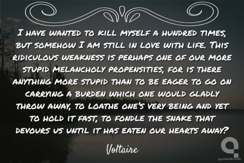 I have wanted to kill myself a hundred times, but somehow I am still in love with life. This ridiculous weakness is perhaps one of our more stupid melancholy propensities, for is there anything more stupid than to be eager to go on carrying a burden which one would gladly throw away, to loathe one’s very being and yet to hold it fast, to fondle the snake that devours us until it has eaten our hearts away?