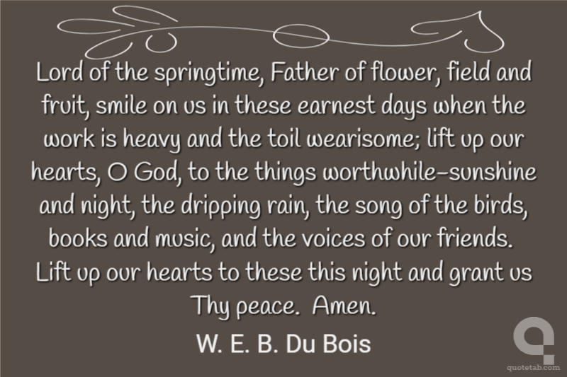 Lord of the springtime, Father of flower, field and fruit, smile on us in these earnest days when the work is heavy and the toil wearisome; lift up our hearts, O God, to the things worthwhile-sunshine and night, the dripping rain, the song of the birds, books and music, and the voices of our friends. Lift up our hearts to these this night and grant us Thy peace. Amen.