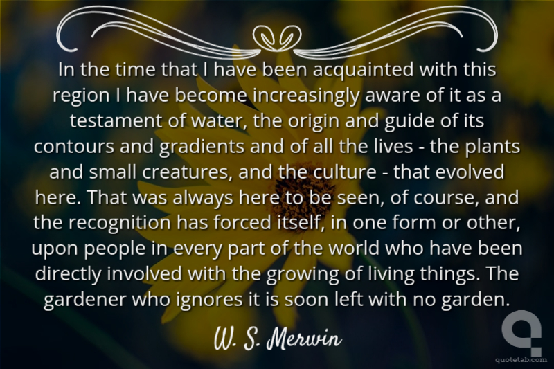 In the time that I have been acquainted with this region I have become increasingly aware of it as a testament of water, the origin and guide of its contours and gradients and of all the lives - the plants and small creatures, and the culture - that evolved here. That was always here to be seen, of course, and the recognition has forced itself, in one form or other, upon people in every part of the world who have been directly involved with the growing of living things. The gardener who ignores it is soon left with no garden.