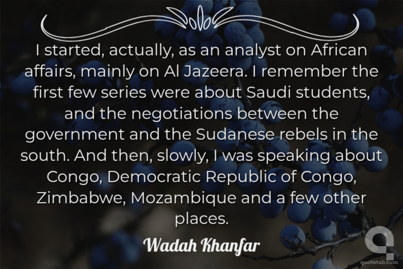I started, actually, as an analyst on African affairs, mainly on Al Jazeera. I remember the first few series were about Saudi students, and the negotiations between the government and the Sudanese rebels in the south. And then, slowly, I was speaking about Congo, Democratic Republic of Congo, Zimbabwe, Mozambique and a few other places.