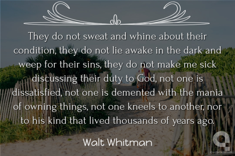 They do not sweat and whine about their condition, they do not lie awake in the dark and weep for their sins, they do not make me sick discussing their duty to God, not one is dissatisfied, not one is demented with the mania of owning things, not one kneels to another, nor to his kind that lived thousands of years ago.