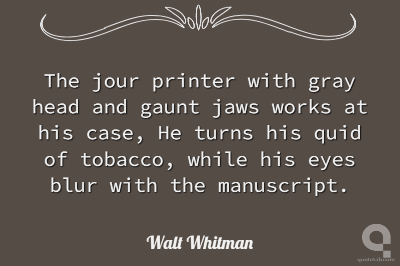 The jour printer with gray head and gaunt jaws works at his case, He turns his quid of tobacco, while his eyes blur with the manuscript.