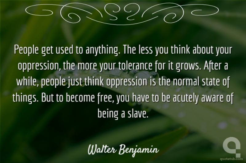 People get used to anything. The less you think about your oppression, the more your tolerance for it grows. After a while, people just think oppression is the normal state of things. But to become free, you have to be acutely aware of being a slave.