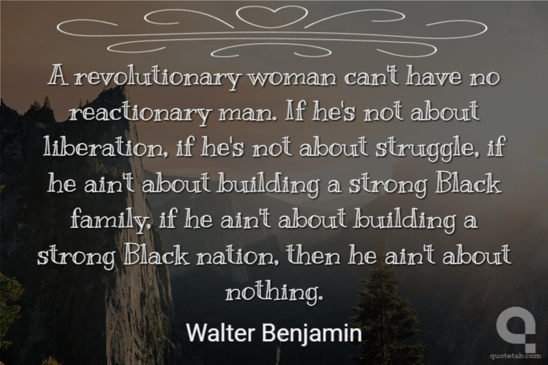 A revolutionary woman can't have no reactionary man. If he's not about liberation, if he's not about struggle, if he ain't about building a strong Black family, if he ain't about building a strong Black nation, then he ain't about nothing.