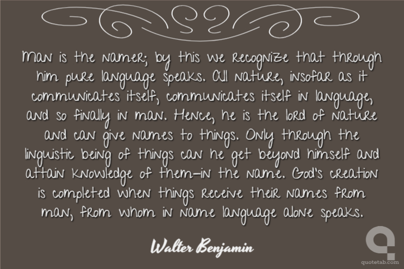 Man is the namer; by this we recognize that through him pure language speaks. All nature, insofar as it communicates itself, communicates itself in language, and so finally in man. Hence, he is the lord of nature and can give names to things. Only through the linguistic being of things can he get beyond himself and attain knowledge of them-in the name. God's creation is completed when things receive their names from man, from whom in name language alone speaks.