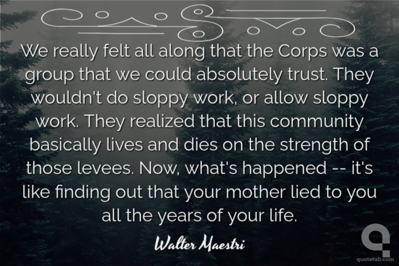 We really felt all along that the Corps was a group that we could absolutely trust. They wouldn't do sloppy work, or allow sloppy work. They realized that this community basically lives and dies on the strength of those levees. Now, what's happened -- it's like finding out that your mother lied to you all the years of your life.