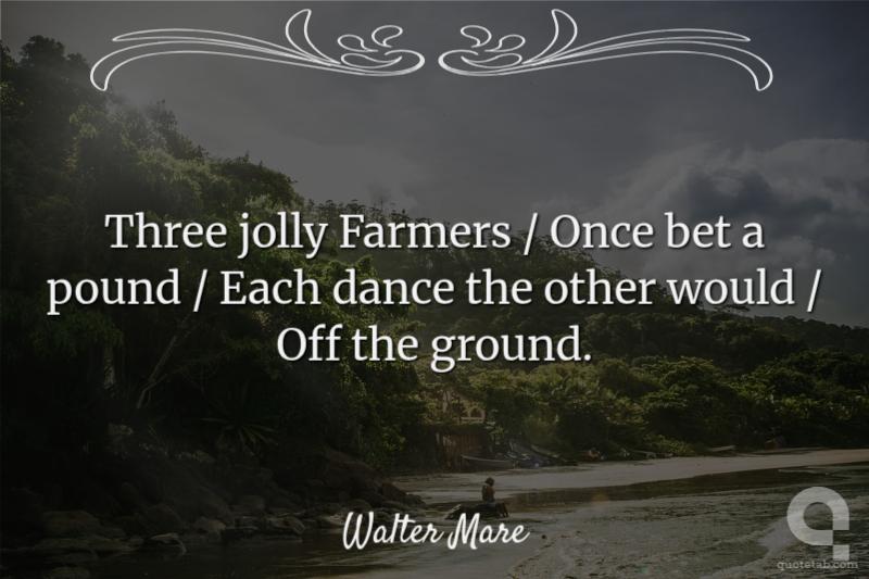 Three jolly Farmers / Once bet a pound / Each dance the other would / Off the ground.