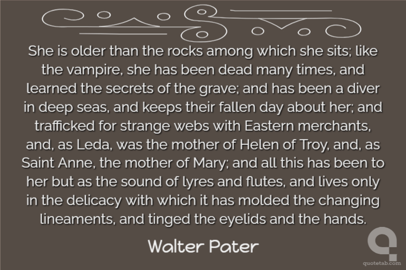 She is older than the rocks among which she sits; like the vampire, she has been dead many times, and learned the secrets of the grave; and has been a diver in deep seas, and keeps their fallen day about her; and trafficked for strange webs with Eastern merchants, and, as Leda, was the mother of Helen of Troy, and, as Saint Anne, the mother of Mary; and all this has been to her but as the sound of lyres and flutes, and lives only in the delicacy with which it has molded the changing lineaments, and tinged the eyelids and the hands.
