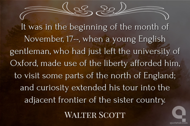 It was in the beginning of the month of November, 17--, when a young English gentleman, who had just left the university of Oxford, made use of the liberty afforded him, to visit some parts of the north of England; and curiosity extended his tour into the adjacent frontier of the sister country.