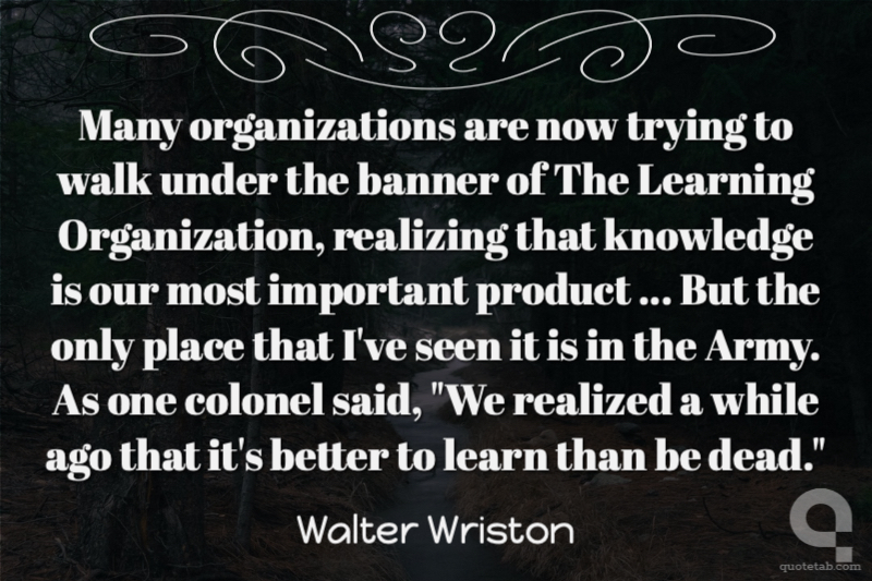 Many organizations are now trying to walk under the banner of The Learning Organization, realizing that knowledge is our most important product ... But the only place that I've seen it is in the Army. As one colonel said, "We realized a while ago that it's better to learn than be dead."