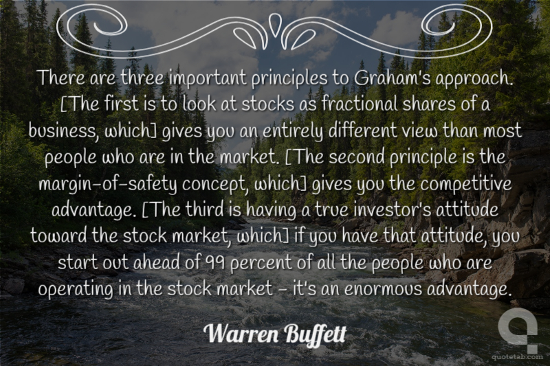 There are three important principles to Graham's approach. [The first is to look at stocks as fractional shares of a business, which] gives you an entirely different view than most people who are in the market. [The second principle is the margin-of-safety concept, which] gives you the competitive advantage. [The third is having a true investor's attitude toward the stock market, which] if you have that attitude, you start out ahead of 99 percent of all the people who are operating in the stock market - it's an enormous advantage.