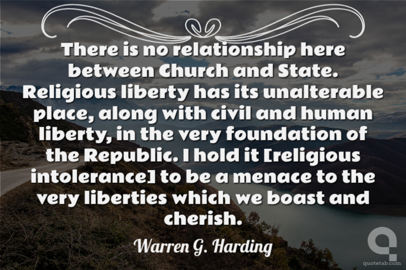 There is no relationship here between Church and State. Religious liberty has its unalterable place, along with civil and human liberty, in the very foundation of the Republic. I hold it [religious intolerance] to be a menace to the very liberties which we boast and cherish.