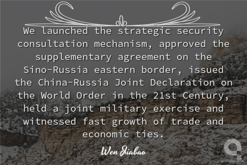 We launched the strategic security consultation mechanism, approved the supplementary agreement on the Sino-Russia eastern border, issued the China-Russia Joint Declaration on the World Order in the 21st Century, held a joint military exercise and witnessed fast growth of trade and economic ties.