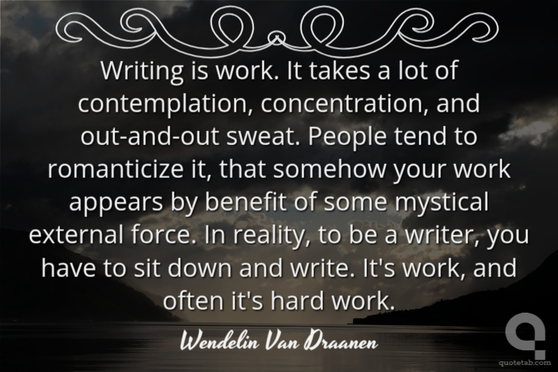 Writing is work. It takes a lot of contemplation, concentration, and out-and-out sweat. People tend to romanticize it, that somehow your work appears by benefit of some mystical external force. In reality, to be a writer, you have to sit down and write. It's work, and often it's hard work.