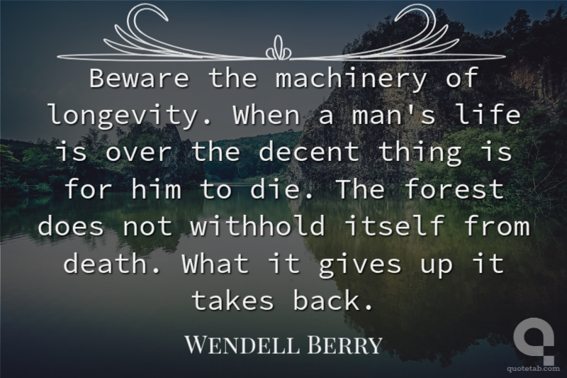 Beware the machinery of longevity. When a man's life is over the decent thing is for him to die. The forest does not withhold itself from death. What it gives up it takes back.