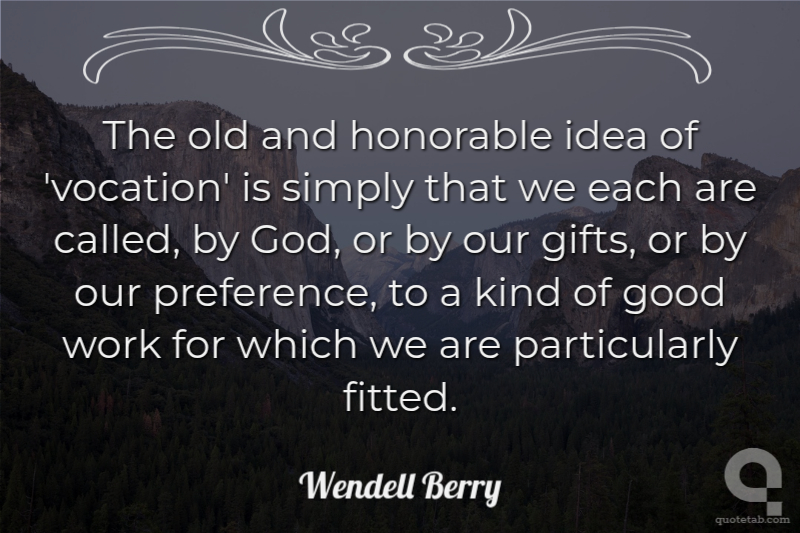 The old and honorable idea of 'vocation' is simply that we each are called, by God, or by our gifts, or by our preference, to a kind of good work for which we are particularly fitted.