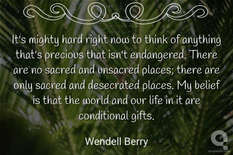 It's mighty hard right now to think of anything that's precious that isn't endangered. There are no sacred and unsacred places; there are only sacred and desecrated places. My belief is that the world and our life in it are conditional gifts.