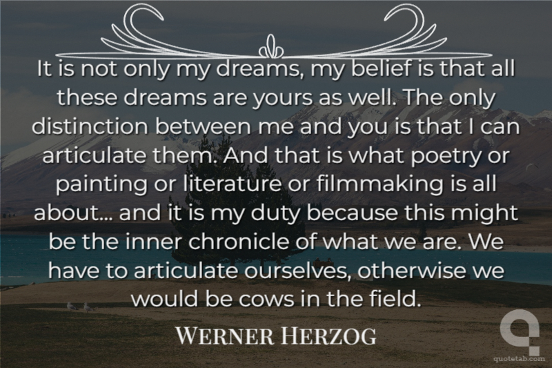 It is not only my dreams, my belief is that all these dreams are yours as well. The only distinction between me and you is that I can articulate them. And that is what poetry or painting or literature or filmmaking is all about... and it is my duty because this might be the inner chronicle of what we are. We have to articulate ourselves, otherwise we would be cows in the field.