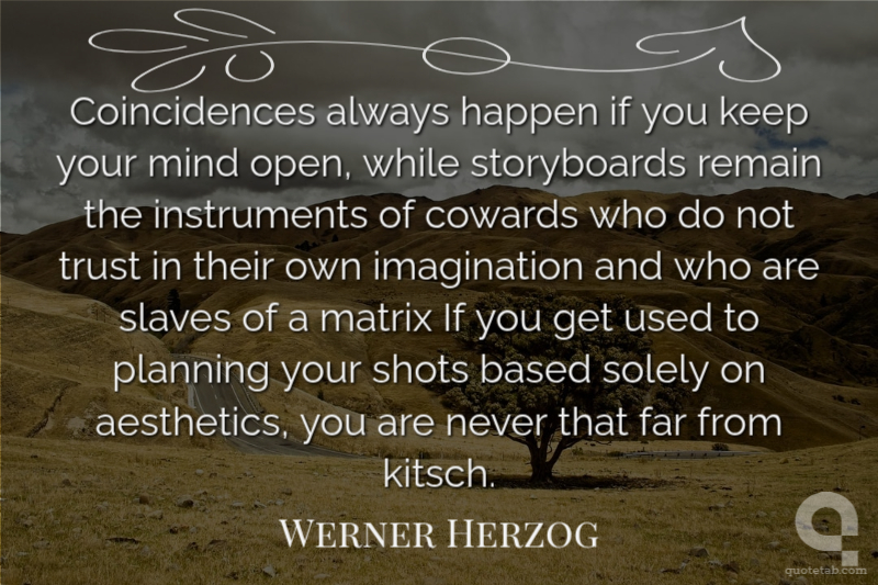 Coincidences always happen if you keep your mind open, while storyboards remain the instruments of cowards who do not trust in their own imagination and who are slaves of a matrix If you get used to planning your shots based solely on aesthetics, you are never that far from kitsch.