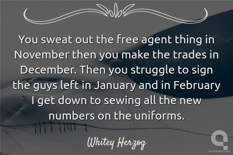 You sweat out the free agent thing in November then you make the trades in December. Then you struggle to sign the guys left in January and in February I get down to sewing all the new numbers on the uniforms.