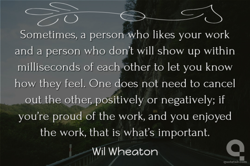 Sometimes, a person who likes your work and a person who don’t will show up within milliseconds of each other to let you know how they feel. One does not need to cancel out the other, positively or negatively; if you’re proud of the work, and you enjoyed the work, that is what’s important.