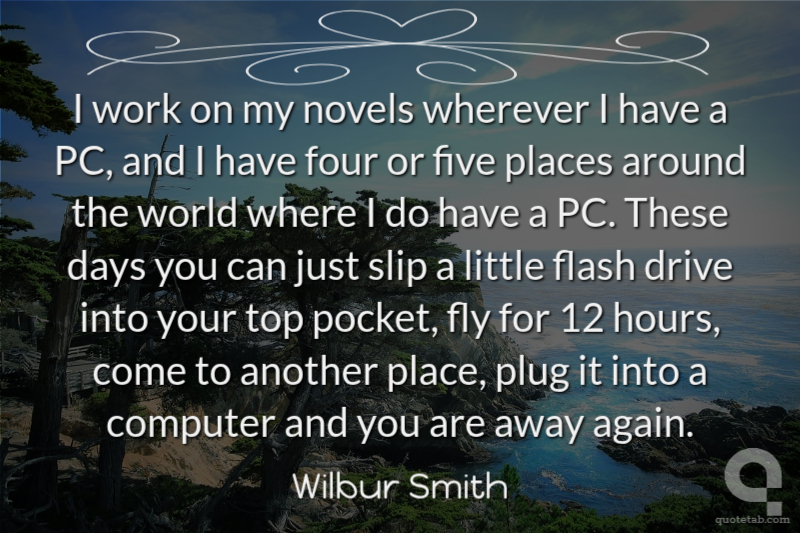 I work on my novels wherever I have a PC, and I have four or five places around the world where I do have a PC. These days you can just slip a little flash drive into your top pocket, fly for 12 hours, come to another place, plug it into a computer and you are away again.