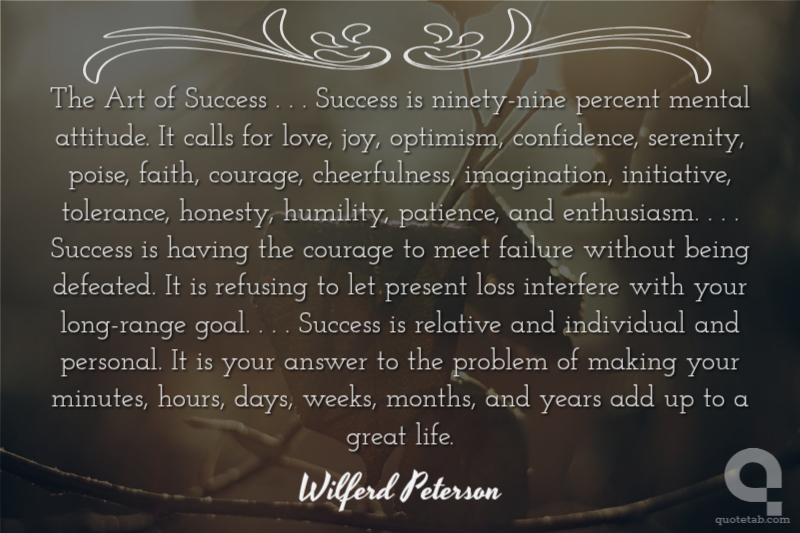 The Art of Success . . . Success is ninety-nine percent mental attitude. It calls for love, joy, optimism, confidence, serenity, poise, faith, courage, cheerfulness, imagination, initiative, tolerance, honesty, humility, patience, and enthusiasm. . . . Success is having the courage to meet failure without being defeated. It is refusing to let present loss interfere with your long-range goal. . . . Success is relative and individual and personal. It is your answer to the problem of making your minutes, hours, days, weeks, months, and years add up to a great life.