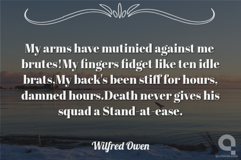 My arms have mutinied against me brutes!My fingers fidget like ten idle brats,My back's been stiff for hours, damned hours.Death never gives his squad a Stand-at-ease.