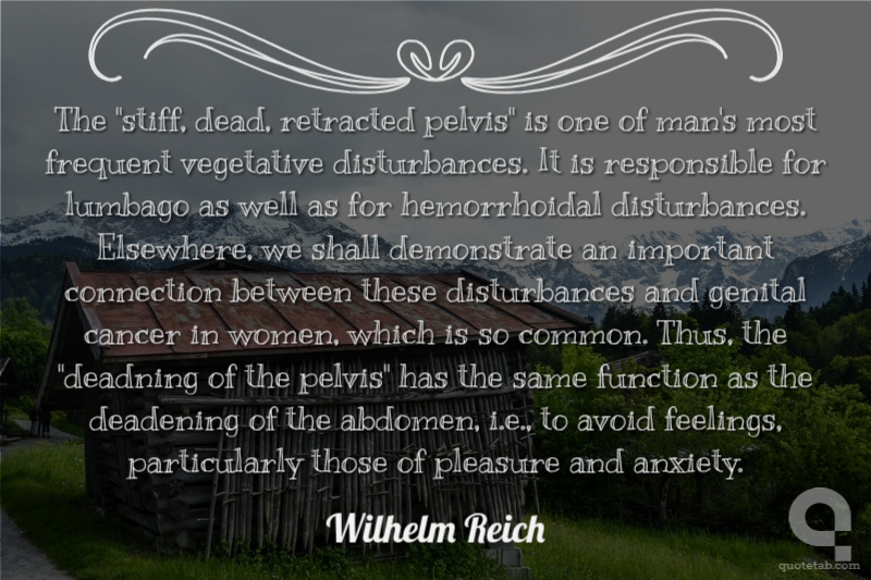 The "stiff, dead, retracted pelvis" is one of man's most frequent vegetative disturbances. It is responsible for lumbago as well as for hemorrhoidal disturbances. Elsewhere, we shall demonstrate an important connection between these disturbances and genital cancer in women, which is so common. Thus, the "deadning of the pelvis" has the same function as the deadening of the abdomen, i.e., to avoid feelings, particularly those of pleasure and anxiety.