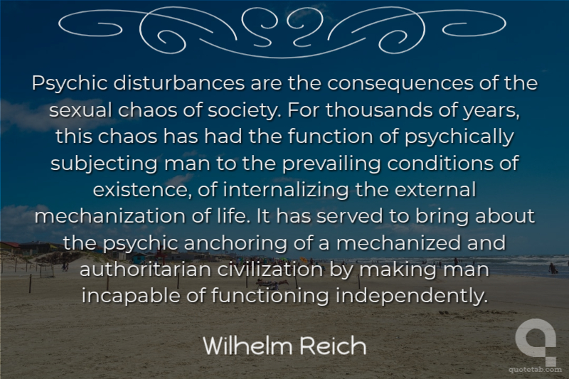 Psychic disturbances are the consequences of the sexual chaos of society. For thousands of years, this chaos has had the function of psychically subjecting man to the prevailing conditions of existence, of internalizing the external mechanization of life. It has served to bring about the psychic anchoring of a mechanized and authoritarian civilization by making man incapable of functioning independently.
