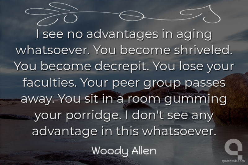 I see no advantages in aging whatsoever. You become shriveled. You become decrepit. You lose your faculties. Your peer group passes away. You sit in a room gumming your porridge. I don't see any advantage in this whatsoever.