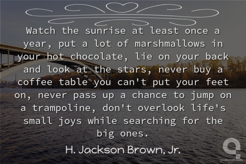 Watch the sunrise at least once a year, put a lot of marshmallows in your hot chocolate, lie on your back and look at the stars, never buy a coffee table you can't put your feet on, never pass up a chance to jump on a trampoline, don't overlook life's small joys while searching for the big ones.