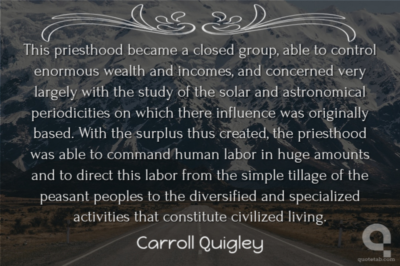 This priesthood became a closed group, able to control enormous wealth and incomes, and concerned very largely with the study of the solar and astronomical periodicities on which there influence was originally based. With the surplus thus created, the priesthood was able to command human labor in huge amounts and to direct this labor from the simple tillage of the peasant peoples to the diversified and specialized activities that constitute civilized living.