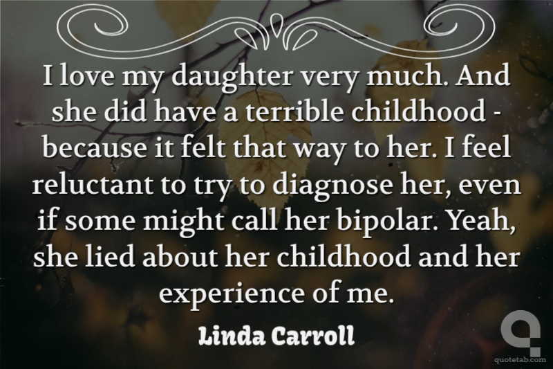 I love my daughter very much. And she did have a terrible childhood - because it felt that way to her. I feel reluctant to try to diagnose her, even if some might call her bipolar. Yeah, she lied about her childhood and her experience of me.