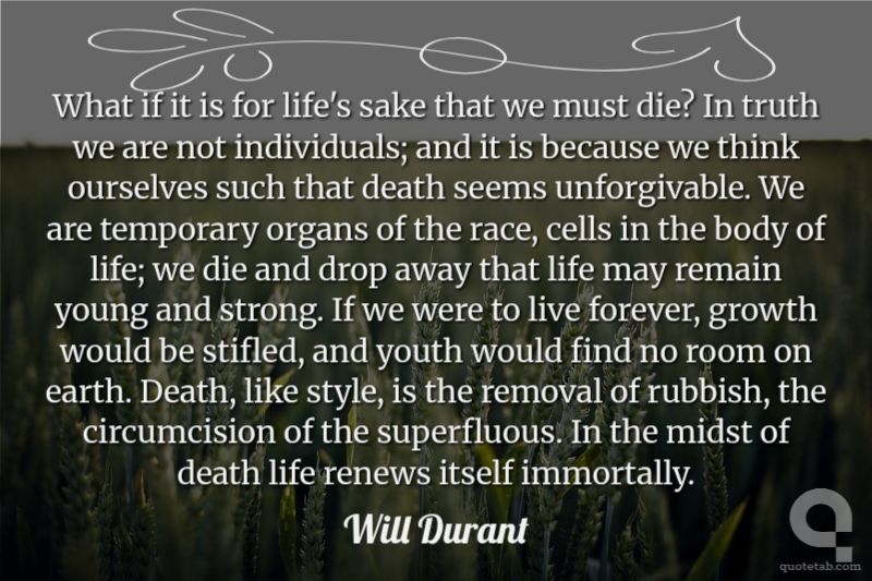What if it is for life's sake that we must die? In truth we are not individuals; and it is because we think ourselves such that death seems unforgivable. We are temporary organs of the race, cells in the body of life; we die and drop away that life may remain young and strong. If we were to live forever, growth would be stifled, and youth would find no room on earth. Death, like style, is the removal of rubbish, the circumcision of the superfluous. In the midst of death life renews itself immortally.