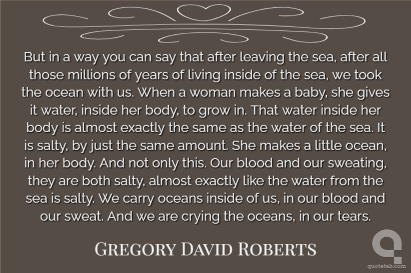 But in a way you can say that after leaving the sea, after all those millions of years of living inside of the sea, we took the ocean with us. When a woman makes a baby, she gives it water, inside her body, to grow in. That water inside her body is almost exactly the same as the water of the sea. It is salty, by just the same amount. She makes a little ocean, in her body. And not only this. Our blood and our sweating, they are both salty, almost exactly like the water from the sea is salty. We carry oceans inside of us, in our blood and our sweat. And we are crying the oceans, in our tears.