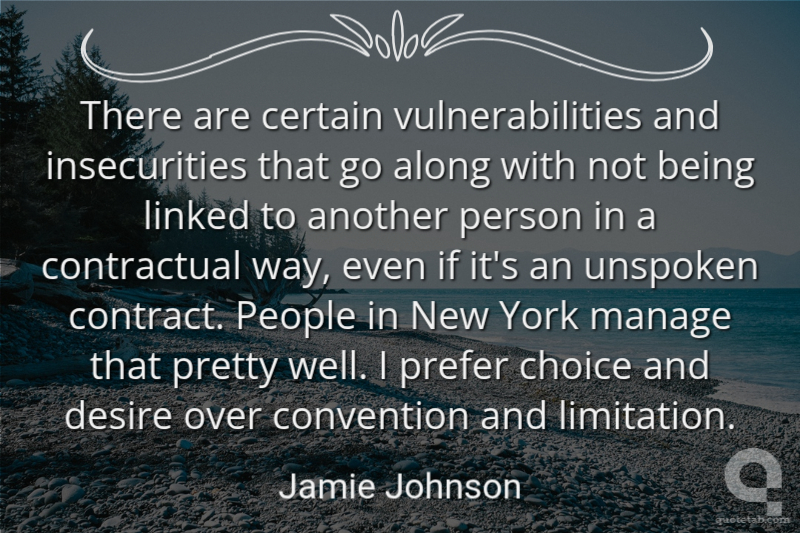 There are certain vulnerabilities and insecurities that go along with not being linked to another person in a contractual way, even if it's an unspoken contract. People in New York manage that pretty well. I prefer choice and desire over convention and limitation.